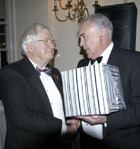 John Bithell, club chairman, presenting a gift on  behalf of the club to John Robertson, in recognition  of his work in organizing and managing  the Anniversary event First Fifteen Group Photograph First left, Paul Woodward, Head Coach; fourth left, Phil Kearns, Club Captain; fifth, Helen Hartley, Club Head Physiotherapist